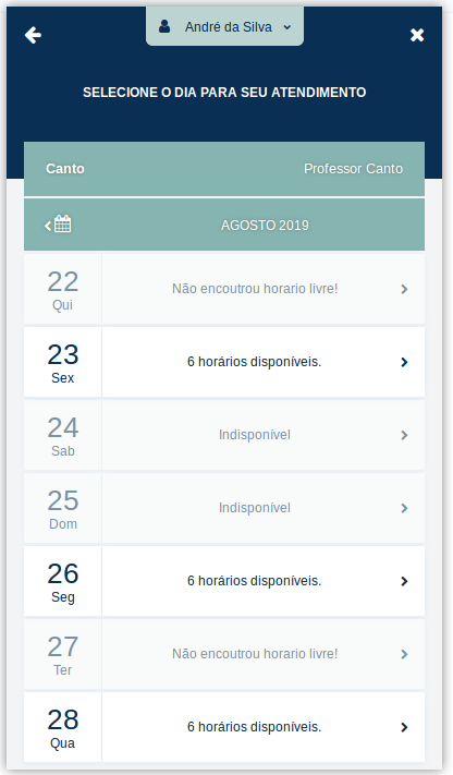 No circuito “Exame Admissional”, o sistema coordena a agenda do médico + técnico + sala, oferecendo ao cliente final os horários disponíveis combinados.